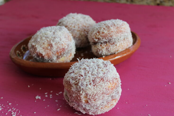 8. The assemble: spread jam on the bottom of the halves and sandwich together to make the beso/yoyo. Rub, spread or smear the jam all over the outside of the sandwiched besos. Roll in coconut until fully coated. Let dry on a cooling rack, about 2 hours.