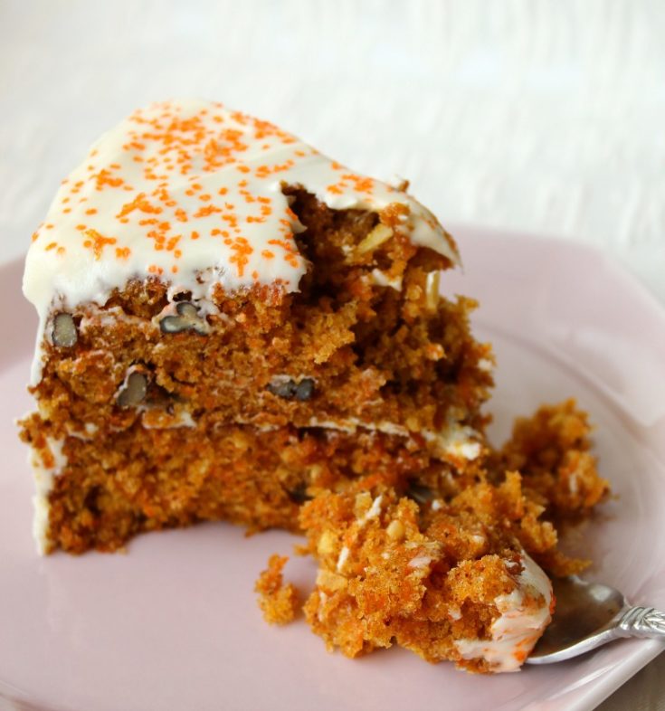 A note on garnishing: I’m a sucker for chopped pecans garnish on a carrot cake. Unfortunately these days we can’t just run out to the store to pick up a few things. So quarantine has humbled us all and taught me to just roll with what ya got. In this case it was orange sprinkles.