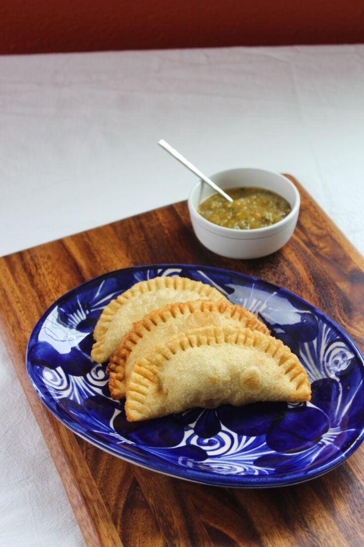 Using simple ingredients and basic tortilla making steps, you can make these fairly quickly. The ingredients are warm water, salt and masa harina. The process: you basically mix everything together and you end up with masa perfect for frying up empanadas. That. Is. It.